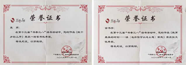 近日,全国第十三届“书香三八”读书活动评选结果正式揭晓,必赢官网青年女教师金书宇作品《教育最美的时刻——读<也许你可以这么想>有感》、袁燕作品《致十岁的儿子》分别获征文类和家书类优秀奖。