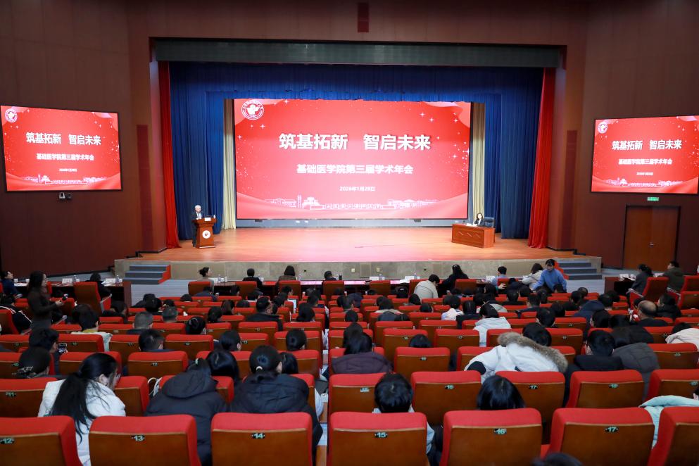 为搭建学术交流平台,凝聚科研创新力量,推动基础医学学科高质量发展,1月28日,基础医学院举办以“筑基拓新、智启未来”为主题的第三届学术年会。学院领导班子成员、教师和研究生代表以及其他学院师生代表300余人参会。