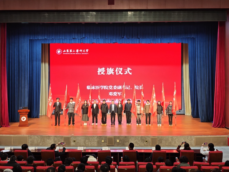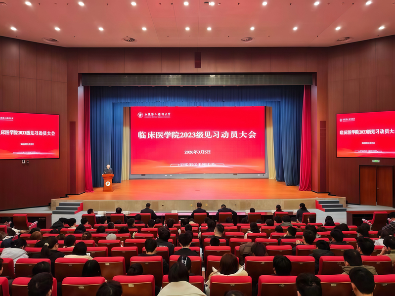 3月5日上午,临床医学院在文体活动中心报告厅举行2023级临床见习动员大会。学院党委副书记、院长邓爱军作见习动员讲话,并为11支见习队授旗,学院党委副书记刘刚主持活动。学院党政领导班子成员、教学部负责人、2023级学生工作办公室辅导员及全体学生参加。