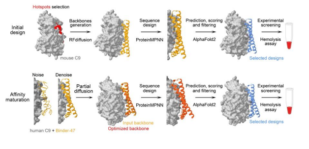 课题组通过一套整合基于深度学习的蛋白骨架生成、序列设计、复合物结构预测的计算蛋白设计方法,首次从头设计出靶向补体C9的高活性迷你蛋白抑制剂(图1),这项研究的意义不仅在于突破了补体C9难以筛选功能性拮抗蛋白的瓶颈(图2),更重要的是提供了新型的补体异常激活抑制思路。这种全新设计的迷你结合蛋白抑制剂在体内急性溶血模型中的治疗效果显著超越现有单克隆抗体药物,展现出更宽广的治疗窗口。此外,还具有极高的产量,在未经优化情况下达126.85 mg/L,以及极强的热稳定性,在95°加热后依旧保持生物学活性不变。