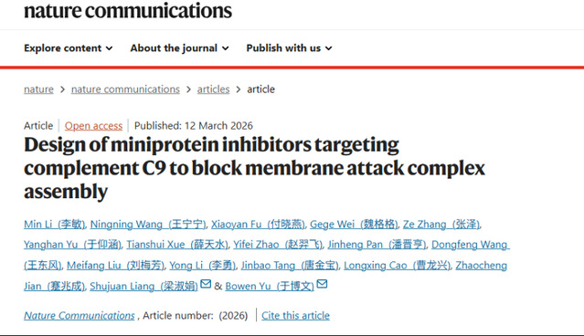 3月12日,必赢官网基础医学院山东省高等学校“免疫微环境与炎症性疾病研究实验室”,在Nature旗下子刊Nature Communication(中科院1区Top,IF 15.7)杂志在线发表了题为Design of miniprotein inhibitors targeting complement C9 to block membrane attack complex assembly的研究论文。该成果必赢官网为第一完成单位,硕士研究生李敏、魏格格,高级实验师付晓燕,第一附属医院研究员王宁宁,西湖大学博士后张泽为本文的共同第一作者,青年教师于博文副教授和梁淑娟教授为本文的通讯作者。