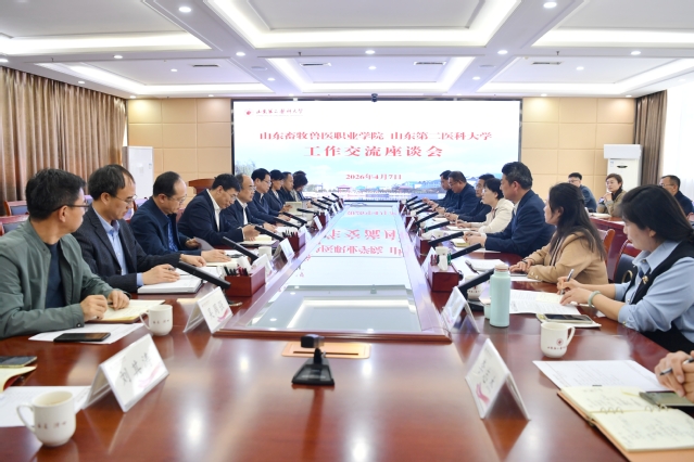 刘传勇对山东畜牧兽医职业学院一行的到访表示欢迎,介绍了近年来学校在医教研协同发展、卓越医学人才培养、医学教育改革创新、科技创新与成果转化、服务地方发展等方面的进展,他指出,两校同为驻潍高校,办学特色鲜明,合作空间巨大,希望以此次交流为契机,进一步拓宽合作深度,共享发展机遇,深化在人才培养、教育教学、科技创新、成果转化等方面的务实合作,共同推动双方高质量发展迈上新台阶,携手为潍坊经济社会发展和现代化强省建设贡献力量。