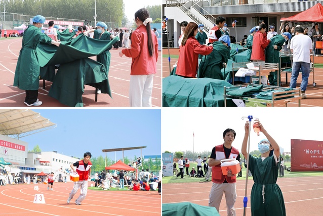 运动会创新性地将临床技能、心肺复苏、运动康复融入竞技项目与赛事服务,设计开展了“桥心护生・负重前行”接力赛,将临床核心技能、思政教育与体育竞技深度融合。比赛中,参赛队员背负5公斤“生命之重”,依次完成七步洗手法、手术区消毒、铺无菌单、穿手术衣戴无菌手套、双人核对输血信息等临床操作闯关,在竞速中锤炼专业素养,在协作中感悟医者使命,生动诠释军桥英烈精神,成为本届运动会最具医学特色、最受师生关注的亮点项目。